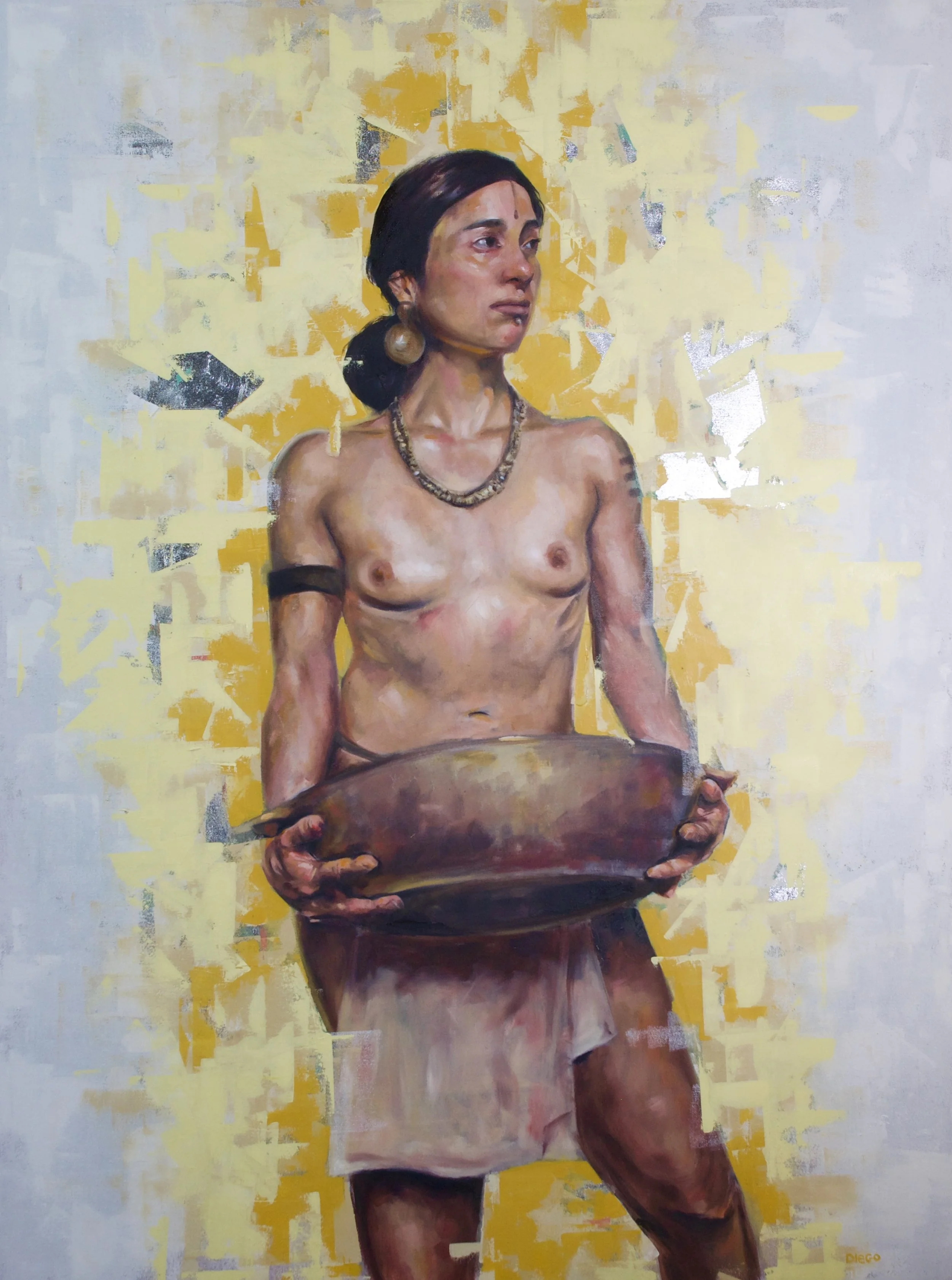 Through my current works, I strive to breathe life into the past, using oil paints to create portraits and scenes inspired by the rich and endangered cultures of indigenous peoples from El Salvador and Central America. My current practice is driven by a profound respect for these cultures, many of which have been nearly erased through colonisation and historical upheaval.